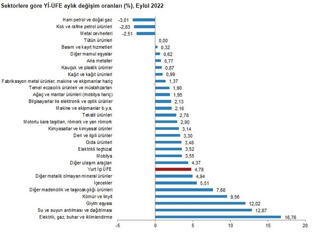 Aylık en yüksek azalış; yüzde 3,01 ile ham petrol ve doğal gaz, yüzde 2,83 ile kok ve rafine petrol ürünleri, yüzde 2,51 ile metal cevherleri alt sektörlerinde gerçekleşti. Buna karşılık elektrik, gaz, buhar ve iklimlendirme yüzde 16,76, su ve suyun arıtılması ve dağıtılması yüzde 12,87, giyim eşyası yüzde 12,02 ile endekslerin en fazla arttığı alt sektörler oldu.