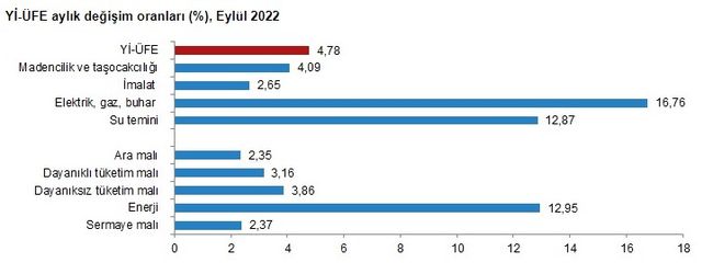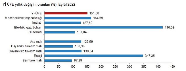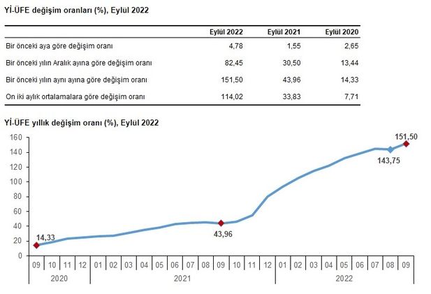 Yurt İçi Üretici Fiyat Endeksi (Yİ-ÜFE) 2022 yılı Eylül ayında bir önceki aya göre yüzde 4,78, bir önceki yılın Aralık ayına göre yüzde 82,45, bir önceki yılın aynı ayına göre yüzde 51,50 ve on iki aylık ortalamalara göre yüzde 114,02 artış gösterdi.