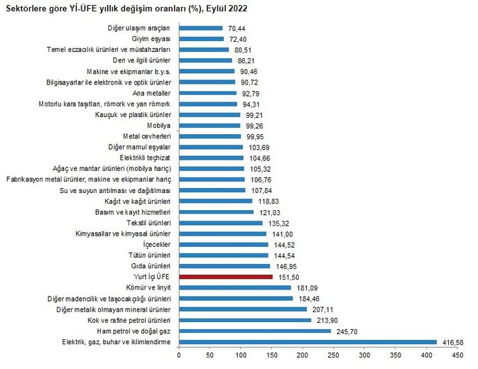 Yıllık en düşük artış; yüzde 70,44 ile diğer ulaşım araçları, yüzde 72,40 ile giyim eşyası, yüzde 80,51 ile temel eczacılık ürünleri ve müstahzarları alt sektörlerinde gerçekleşti. Buna karşılık elektrik, gaz, buhar ve iklimlendirme yüzde 416,58, ham petrol ve doğal gaz yüzde 245,70, kok ve rafine petrol ürünleri yüzde 213,90 ile endekslerin en fazla arttığı alt sektörler oldu.